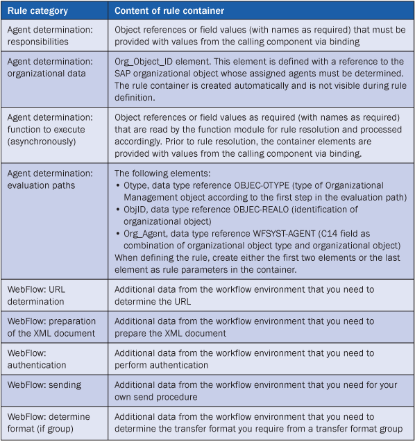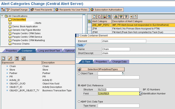 As you see in Figure 13 in the Container tab, you define parameters to determine the rule. Once the value from SAP NetWeaver BW is passed to SAP CRM, these parameters determine the rules and then the users. The alert container is a container for the exchange of application-specific variables, such as the person responsible between local systems and the central alert server. It is the interface between the SAP application and the different SAP systems that triggers the alert and the CAF.