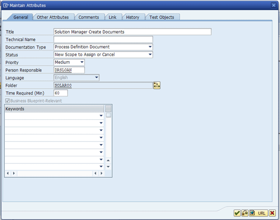 To add information about the duration of this particular training item, click the General Tab. You can find the duration only by using transaction SOLAR_LEARNING_MAP and clicking the General tab of the document attributes pop-up screen. The other document attributes are accessible and maintainable in transactions SOLAR01 and SOLAR02 by using the attributes icon.