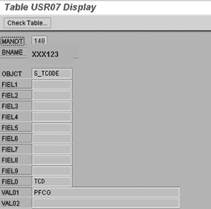 When a user runs transaction SU53, the system loads data into table USR07. The table is populated with a single record containing information relevant to this denial. In the case of the situation displayed in Figure 1, the system created a new entry in this table (Figure 2). To browse the data in this table, run transaction SE16 (table browser), and enter your user ID in the BNAME field.