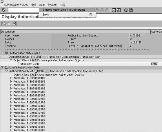 The situation illustrated in the previous example was a straightforward one. However, things aren’t always that transparent in an SAP system, especially when you are running a process that integrates functionalities across different modules. In such a scenario, the user needs to check a diverse set of authorization objects and may not have authorizations to one or more of these. Even though you see the last authorization failure in transaction SU53, the root cause may lie deep down in the hierarchy of functions that you executed in this particular process. The administrator needs to carry out systematic analysis to find the root cause armed with knowledge and understanding of the process or activity that triggered this denial. Several tools and techniques in standard SAP help in this process, including authorization trace (transaction ST01) and the various reports in the User Information System (transaction SUIM).