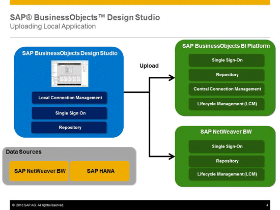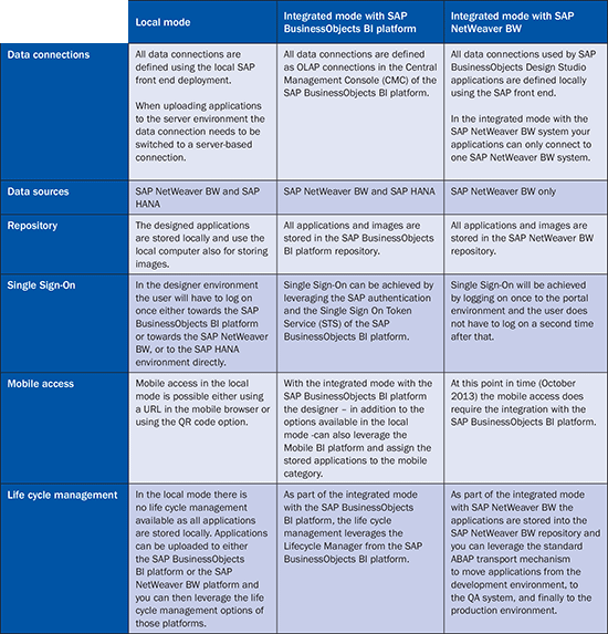 After designing the application in the local mode, the developer is able to upload the application to the integrated platform, which can be either the SAP BusinessObjects BI platform or SAP NetWeaver BW directly (