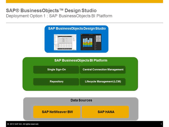 With the current release of SAP BusinessObjects Design Studio – release 1.1 – the product is limited to two major data sources, SAP NetWeaver BW and SAP HANA.