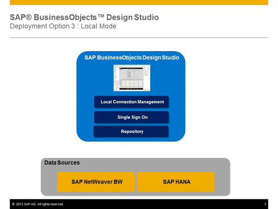 SAP BusinessObjects Design Studio now supports two main deployment options for your production deployment: one integrated with the SAP BusinessObjects BI platform and another with the SAP NetWeaver BW system directly without the requirement to have an SAP BusinessObjects BI platform. In addition – mainly for the developer – SAP BusinessObjects Design Studio also supports a local deployment.