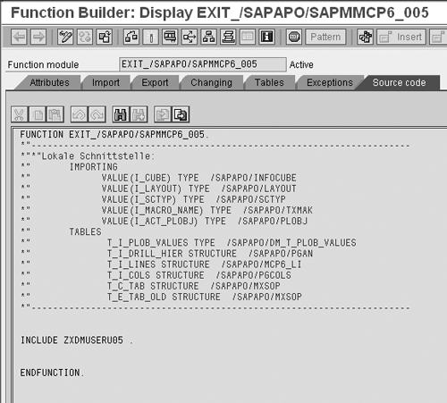 This function module has the include where you can write the user exit code for the task that you want the macro to perform. Double-click on the function module EXIT_ /SAPAPO/SAPMMCP6_005 to access this code (Figure 10). The include program ZXDMUSERU05 contains the ABAP code in which you can code your user exit routine for your macro.