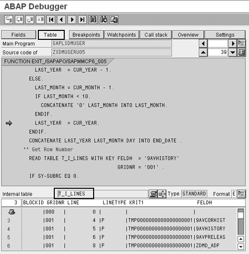 Debug the internal table T_I_LINES