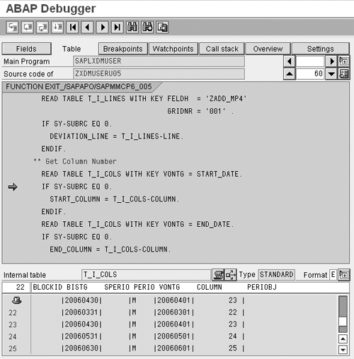 You must check the user exit include code for the significant subtasks that you expect the macro to perform. Figures 11, 12, and 13 from the debugging demonstrate the influence of the code. In these figures, we use three different internal tables that the system maintains to read the data stored in the planning book. Figures 11-13 show the sample data available from each of three internal tables. You can click on the Table tab in these figures to view the contents of the internal tables. In the Internal table field at the bottom of the screen, enter the name of your internal table to view the data.