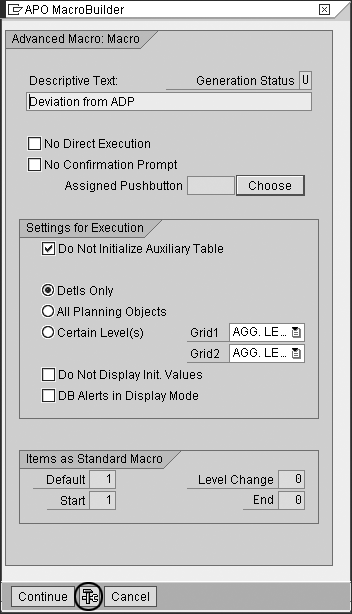 Start Macro Workbench using the transaction code /SAPAPO/ADVM. From the list of macro books available, select your macro and click on the Start MacroBuilder button in the top left corner of the screen. This opens the APO MacroBuilder screen for the selected macro as shown in Figure 1.