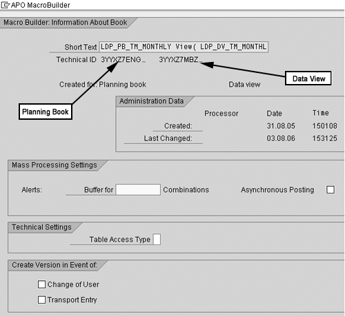 In this screen, you see that the macro is attached to planning book LDP_PB_TM_MONTHLY and data view LDP_DV_TM_MONTHLY. You can also cross-check the Technical ID from Figure 3 for each of these under the Short Text field.