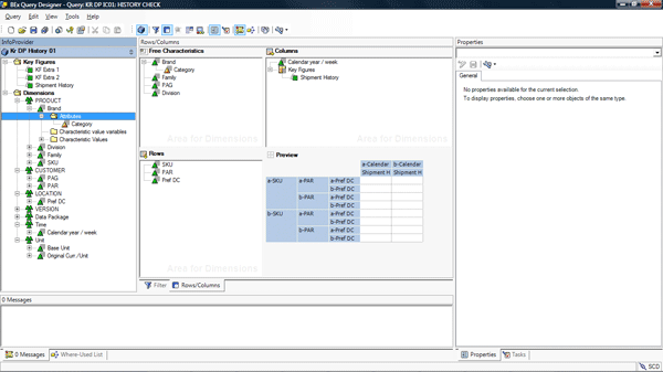 Next you can build queries and reports in SAP NetWeaver BW to execute calculations on the data that you have imported from SAP APO to SAP NetWeaver BW. You can build new queries in BEx Query Designer based on InfoProviders in SAP NetWeaver BW. To create a query, you need to log in to the BEx Query Designer using your SAP NetWeaver BW user ID and password. The define query screen opens up and here you define the rows and columns for the report layout (Figure 10). The rows in my example are SKU, Customer, and DC, while the key figure is Shipment History. The layout of the query output is shown in the preview. Once you create the query, you can then use it for Microsoft Excel-based analysis in BEx Analyzer or for Web-based analysis in BEx Web Analyzer. The data analysis is based on InfoProviders from SAP NetWeaver BW.