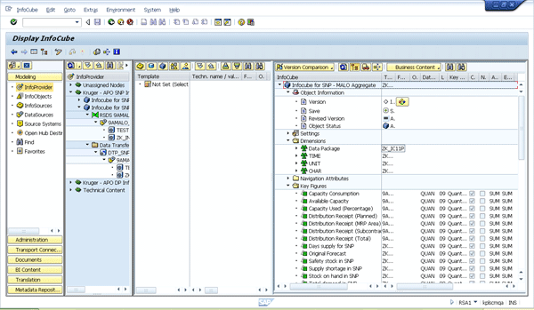 Once you have checked that the SNP data is being extracted properly, you create an SNP cube in SAP APO to store this data. Use transaction RSA1 and create an InfoCube for storing the SNP planning area data (Figure 7). The SNP cube should have all the key figures of the SNP planning area that you need to extract to SAP NetWeaver BW. This includes the new custom key figures created to copy LC order data to LC time series.