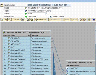 Go to the Modeling tab and select the InfoCube you have created in SAP NetWeaver BW. Right-click the InfoCube and select the Create Transformation Rule option. Then you create transformation rules and connect the above data source from SAP APO to the SAP NetWeaver BW InfoCube. The source fields on the left are from the SAP APO data source and the target is the fields in the SAP NetWeaver BW InfoCube (Figure 9).