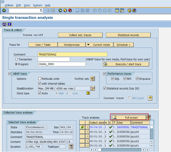 Click the back icon to navigate back to the transaction code ST12 screen. The system ends the trace collection. Clicking the Full screen button in Figure 5 takes you to the trace results shown in Figure 6.