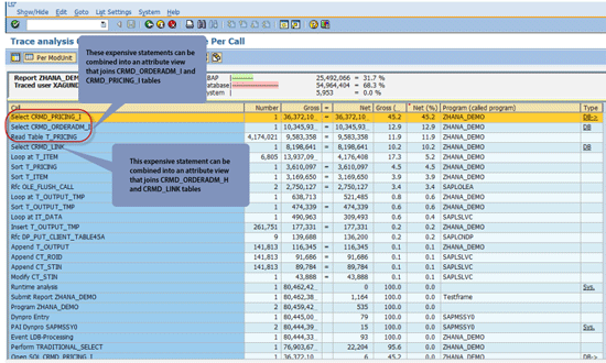 Click the ABAP trace button to evaluate the trace (Figure 6). The trace results in Figure 7 show that most of the time is spent on SQL queries fetching item and pricing data. These queries can be combined into attribute views. The queries on tables CRMD_ORDERADM_I, CRMD_PRICING_I, CRMD_ORDERADM_H, and CRMD_LINK can be combined into attribute views.