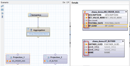 Select the Join node and create a join between the two Projection nodes on the BP_GUID and PARTNER_GUID fields (Figure 44).