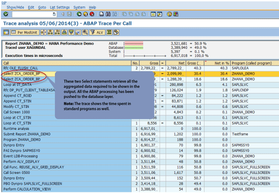 Figure 51 shows the trace results sorted by the column Net time in % for With Calculation View mode. The two highlighted queries in Figure 51 retrieve and aggregate all the necessary data in the calculation views with all the ABAP processing pushed to the database layer.