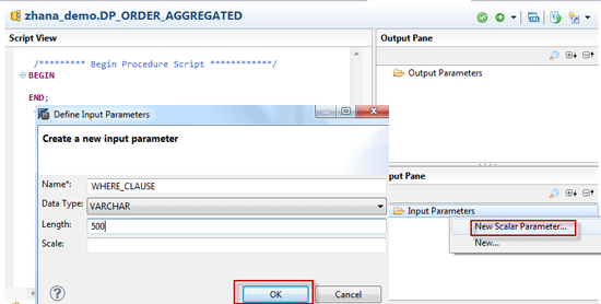 Create an input parameter WHERE CLAUSE by right-clicking the Input Parameters folder and selecting New Scalar Parameter (Figure 54). Applications calling the procedure use this parameter to pass the selection criteria to the procedure. Clicking the OK button creates the parameter.