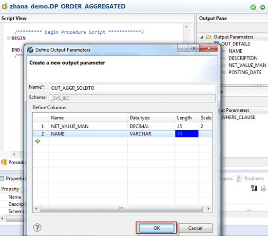 Similarly, create another output parameter table to hold the aggregated sales value by sold-to party by right-clicking the Output Parameters folder and clicking the New… button (Figure 56). Name the output parameter, define the columns, and click the OK button.