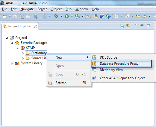 A proxy needs to be created for this procedure so that the ABAP program can invoke it. Go to the ABAP perspective in SAP HANA Studio using menu path Window > Open Perspective > ABAP. Create a Database Procedure Proxy by right-clicking the Dictionary folder and selecting New > Database Procedure Proxy (
