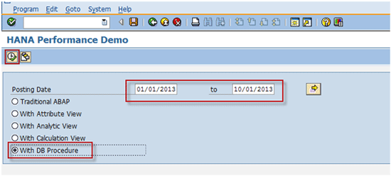 Enter the same date range used before and select the With DB Procedure radio button (Figure 64). Click the execute icon or press F8 to run the program.