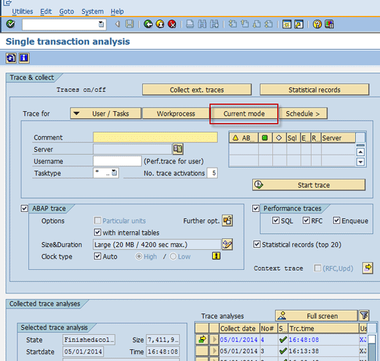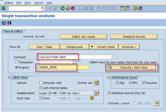 Run a performance trace for the report in traditional ABAP mode. Use transaction code ST12 to run the trace. ST12 is a combination of SE30 (ABAP Runtime Analysis) and ST05 (SQL Trace). Open transaction ST12 (Single Transaction Analysis) and click the Current mode button in Figure 1, which takes you to Figure 2.