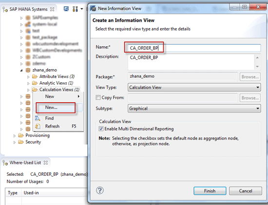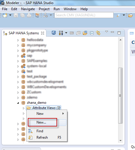 Go the Modeler perspective in SAP HANA Studio using menu path Window > Open Perspective > Modeler. Create an attribute view in the Modeler perspective by right-clicking the Attribute Views folder and clicking the New… button (Figure 8).