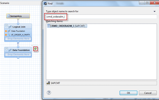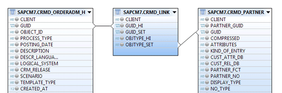 - Create an attribute view AT_ORDER_H_PARTNER to retrieve the header and sold-to party information by joining CRMD_ORDERADM_H, CRMD_LINK, and CRMD_PARTNER tables