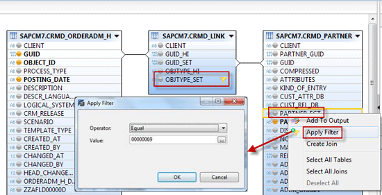 Create a filter on the PARTNER_FCT field by right-clicking it and selecting the Apply Filter option (because only the sold-to party partner function is needed). In the pop-up, enter the filter Value 00000069 (sold-to party) as shown in Figure 12. Similarly, apply a filter for OBJTYPE_SET with the value 07 (partner set).