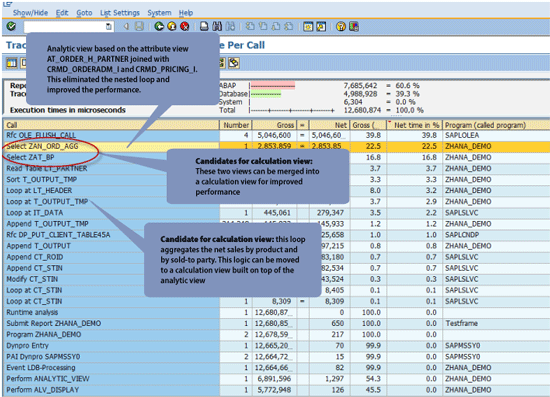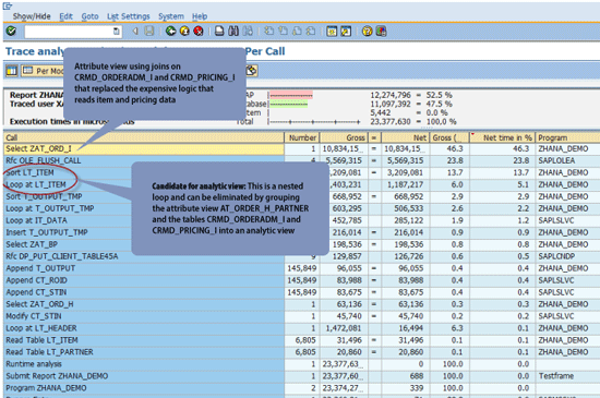 Click the ABAP trace button to evaluate the trace (Figure 6). The trace results in Figure 7 show that most of the time is spent on SQL queries fetching item and pricing data. These queries can be combined into attribute views. The queries on tables CRMD_ORDERADM_I, CRMD_PRICING_I, CRMD_ORDERADM_H, and CRMD_LINK can be combined into attribute views.