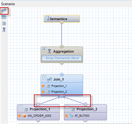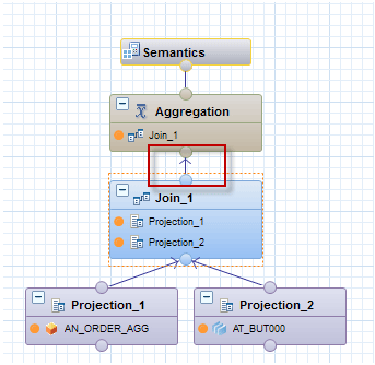 Add a Join node by dragging and dropping the highlighted join icon and link the Projection nodes to it (Figure 43). The Join node is needed to join the views in the Projection nodes.