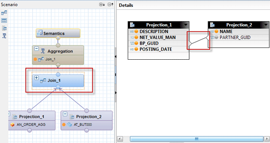 Select the Join node and create a join between the two Projection nodes on the BP_GUID and PARTNER_GUID fields (Figure 44).