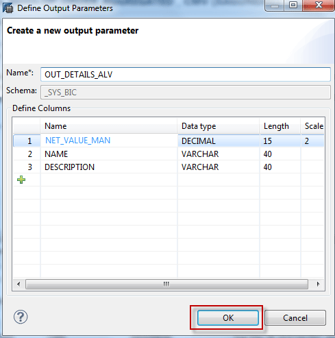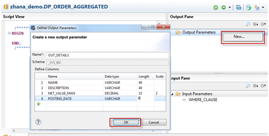 Similarly, create another output parameter table to hold the aggregated sales value by sold-to party by right-clicking the Output Parameters folder and clicking the New… button (Figure 56). Name the output parameter, define the columns, and click the OK button.