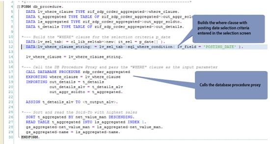 - Consume the database procedure proxy in the program by passing the posting date selection criteria in the form of a where clause as the input parameter