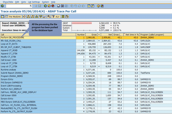 Figure 66 shows the trace results sorted by the column Net time in % for the With DB Procedure mode. All the processing in the ABAP program has been pushed to the database layer.