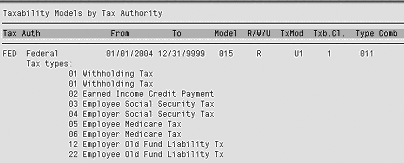 Finally, the federal tax model uses tax combo 014 when tax class L is associated with resident taxes. Tax types 01 and 02 are set to Y in this tax combo. This is because 401(k) contributions reduce the federal wage basis for withholding tax and EIC but they do not affect Social Security or Medicare taxes.