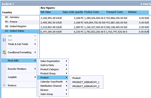 An additional new function in SP04 is the ability to filter and swap a characteristic at the same time. This function is called Pivot With and Filter. In the example in Figure 15, a crosstab shows the characteristic Country in the rows and a set of key figures in the columns.