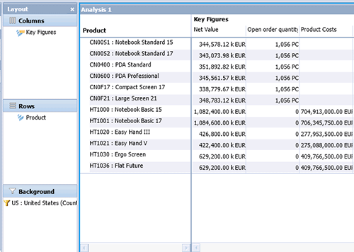 After making your selection, the crosstab is updated to show the characteristic Product in the rows, and the selected members from the characteristic Country have been assigned as a filter (Figure 17).