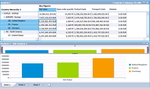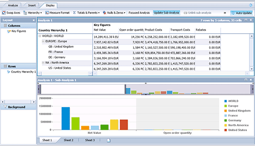 For example, let’s assume I have a crosstab showing a country hierarchy in the rows, with a few key figures in the columns. I have also created a sub-analysis in the form of a chart, and I configured the focused analysis from the Analyze tab between these two components (Figure 18).