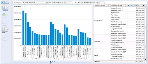 A frequently requested enhancement by customers in SAP BusinessObjects Explorer has been the ability to have two dimensions available for data visualizations. For example, with this feature now available in SP04, you can show the revenue broken down not only by country but also by country and product (Figure 5).
