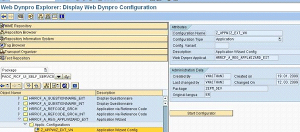 The newly created configuration appears as a sub node under the Web Dynpro Application for which it has been created. Figure 7 shows how the newly created configuration Z_APPWIZ_EXT_VN, appears under the Web Dynpro Application - HRRCF_A_REG_APPLWIZARD_EXT.