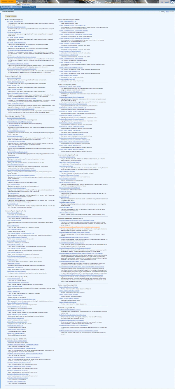 Now let’s take a look at the contents of the launchpad by clicking the line FINREP, ERP63. Figure 6 shows the role FINREP and includes a folder for each application for which new reports are delivered. Note that my screenprints are taken from an SAP ERP 6.0 system with enhancement package 4. The first three folders in the list are Profit Center Reporting, Segment Reporting, and General Ledger Reporting (all from enhancement package 3) and are designed for use with SAP General Ledger (formerly the new G/L). The rest are for use with the classic applications: Accounts Payable Reporting (FI-AP), Accounts Receivable Reporting (FI-AR), Cost Center Reporting (CO-OM-CCA), Internal Order Reporting (CO-OM-OPA), Product Cost Reporting (CO-PC) (all from enhancement package 3) and Asset Accounting Reporting (FI-AA), Investment Management Reporting (IM), and Profitability Analysis (CO-PA) (all from enhancement package 4). Finally, there is a folder offering reports for use with the SAP ERP Financial closing cockpit (the contents of which are shown in Figure 3).