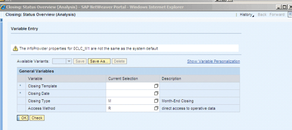 All delivered queries include the variable Access Method and allow you to switch between access method R (i.e., direct access to operative data) and method C (i.e., access to replicated data) as the report requires. This is illustrated for the Close Status report in Figure 10.