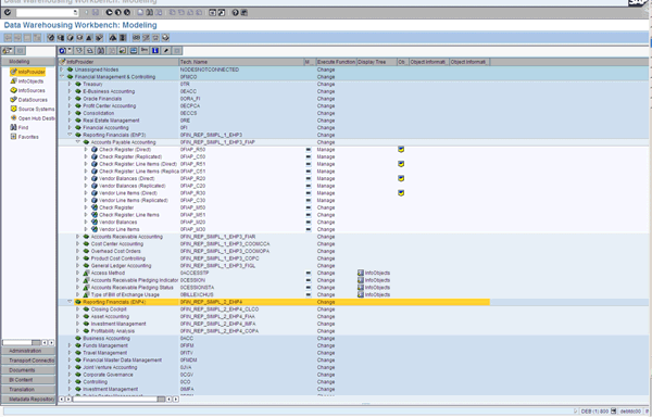 Exploring the contents of the report launchpad, you can also discover a number of SAP NetWeaver BW Web templates – shown with the word “Analysis” in Figure 1. If you are already running SAP NetWeaver BW, then you can simply have your administrator activate the relevant business content for SAP NetWeaver BW 7.0 and proceed as usual. Your administrator can find the delivered business content in the data warehousing workbench (transaction RSA1 in SAP NetWeaver BW) under the InfoAreas 0FIN_REP_SIMPL_1_EHP3 - Reporting Financials (enhancement package 3) and 0FIN_REP_SIMPL_2_EHP4 - Reporting Financials (enhancement package 4), as shown in Figure 9. Again, for enhancement package 3, you can find new InfoAreas for Accounts Payable Accounting, Accounts Receivable Accounting, Cost Center Accounting, Overhead Cost Orders, and Product Cost Accounting. For enhancement package 4, you can find new InfoAreas for Closing Cockpit, Asset Accounting, Investment Management, and Profitability Analysis.