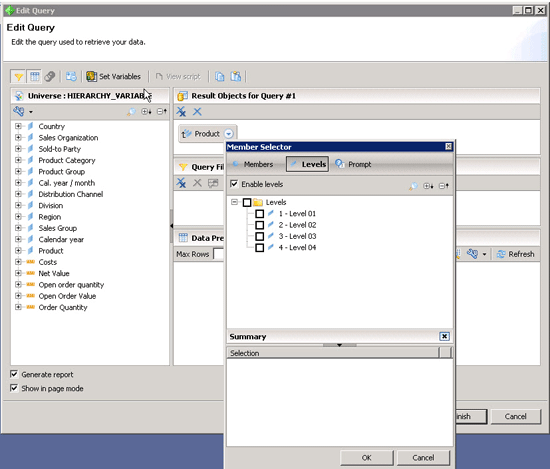 If you create a level-based selection and the consumer of your report changes the value for the hierarchy variable, the defined level selection is still used when the report is refreshed. The corresponding hierarchy levels of the newly selected hierarchy will be shown in your report.