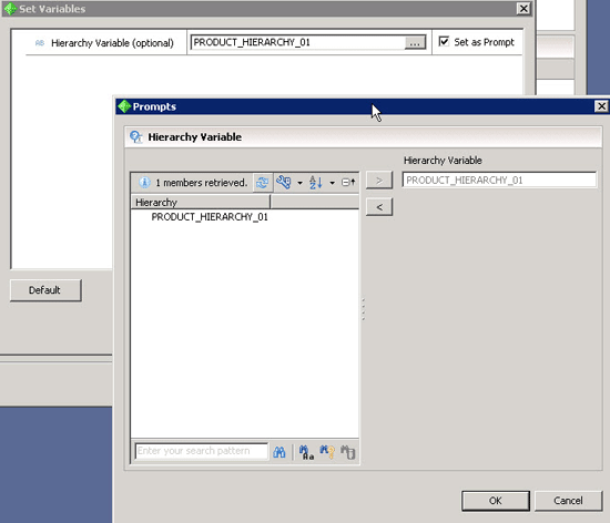In the case of a hierarchy variable the user can leverage the variable manager (Figure 5) as part of the query panel first. After setting the default hierarchy the user is now able to create a level-based selection for the hierarchy instead of selecting a set of fixed members.