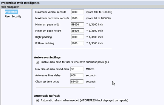Figure 9 shows the configuration dialog in the Central Management Console (CMC) for the Web Intelligence application. Here your administrator can configure the auto refresh option, so that the user can then configure the auto refresh option per report.