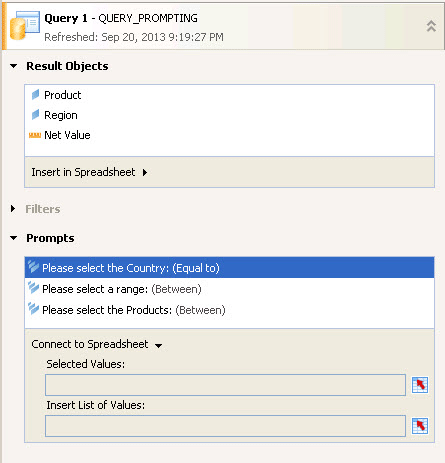 As shown in Figure 12, you can now bind your prompts based on BEx query variables to cells in the underlying Microsoft Excel sheet. With this new ability you can leverage all the different capabilities of SAP BusinessObjects Dashboards to pass a value to the underlying BEx query. You can now pick up the value from the underlying spreadsheet. This ability is part of SAP BusinessObjects BI 4.1 Service Pack 01 (SP01).