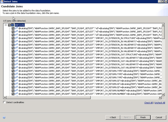 Figure 14 shows the ability to detect the joins in your SAP ERP-based universe, which becomes especially helpful when combining multiple InfoSets or ABAP functions into a multi-source universe. You now can use the functionality to automatically detect the necessary joins between the different sources. The suggested joins are based on the primary and foreign keys.