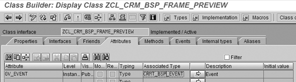 Once you’ve created the attribute GV_ EVENT, you need to populate it. In class ZCL_CRM_BSP_FRAME_ PREVIEW select the Methods tab. In the screen that appears, enter IF_CRM_ BSP_FRAME_ COM~DO_GET_DATA in the Method field. At the end of code append the following: