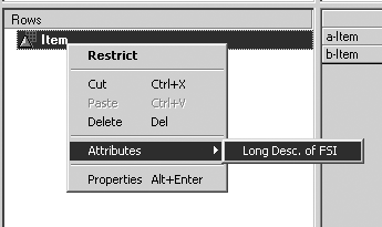 Right-click on the characteristic and choose Properties. In the Properties for Characteristic Item screen, enter key in the Display As field and click on the OK button, which returns you to the previous screen. Right-click on the characteristic again and select Attributes in the menu. You will see your newly assigned attribute (Figure 8), which allows the long text of the characteristic to be displayed along with its key.