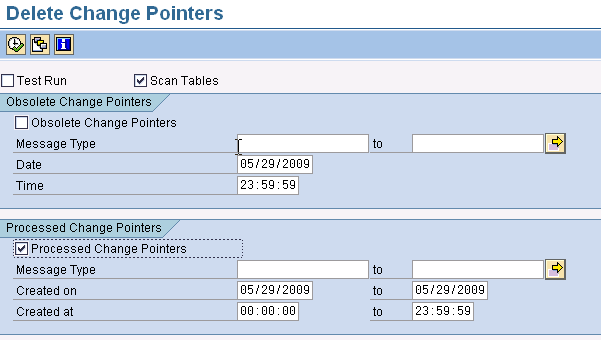Note that as the change pointers are logged for every new record or changes made, it is important that you run the delete or change pointer clean-up program (RBDCPCLR). This program deletes the processed and obsolete change pointers. Figure 19 displays the program that allows you to delete the processed and obsolete change pointer with message type.